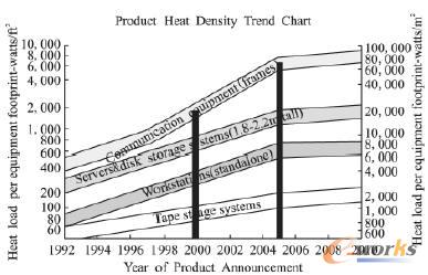 另外,消耗的能量除了供各種計算機組件工作外,還產生大量的熱量,由于大部分計算機組件只能在一定的溫度環境下才能保證足夠的可靠性,因此,還需要額外的能量驅動制冷設備,Netapp的調查表明大型數據中心中制冷系統的能耗僅次于服務器,圖1列出了數據中心主要設備的熱密度趨勢.可以認為,數據中心的能耗問題處于一個惡性循環的狀態。