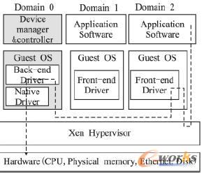 虛擬機技術也帶來了一系列的問題,正如前面提到的,虛擬機技術最初使用在IBM360的大型機中,大型機中往往采用專門的通道來來保證外部設備的訪問和性能,但是,將該技術移植到基于商用組件的X86環境下,由于缺乏專用的通道和通道處理機來應對I/O訪問,虛擬機環境下的I/O問題已經成為當前虛擬機系統中面臨的最大問題,在傳統的計算機系統中,應用程序通過系統調用產生異步I/O操作后直接返回,待I/O操作完成后會產生中斷給操作系統,并將I/O操作產生的數據交給應用程序,然而在虛擬機環境下,該過程被極大地復雜化了,以圖5為例,在第二個域中的應用程序通過系統調用產生異步I/O,該I/O指令會進入虛擬機管理程序(Hypervisor),該管理程序將該I/O操作轉給第零個域,然后返回到第二個域的操作系統(因為是異步I/O)和上層的應用程序,此時第零個域的操作系統將進行實際的I/O操作,待I/O完成后,會產生一個虛擬中斷給第零個域的操作系統,該操作系統給虛擬化軟件發出相應的虛擬中斷,待虛擬化軟件完成I/O后,會給第零個域的操作系統返回一個系統調用來喚醒第二個域的操作系統,然后虛擬機管理程序將I/O完成的中斷交給第二個域的操作系統,最后將I/O操作產生的數據交給第二個域中的應用程序,由此可見,在虛擬機環境下的I/O操作必將成為整個系統的瓶頸。