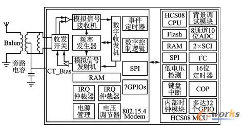 作者從系統的穩定性、可靠性、芯片體積以及對其熟悉程度等方面因素考慮,最終確定使用Freescale公司的MC13213單芯片解決方案。MC13213芯片的功能框圖如圖2所示。