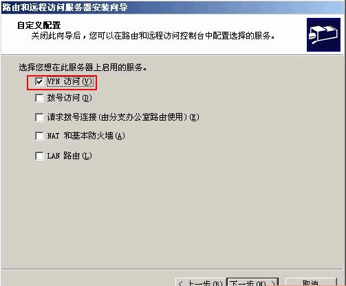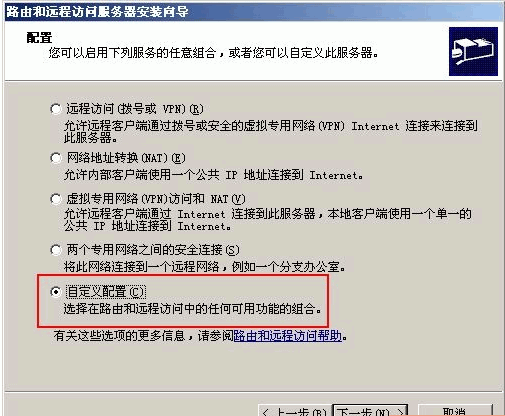 彈出“路由和遠程訪問服務器安裝向導”對話框,單擊下一步,選中自定義配置,下一步,選擇自定義配置,如圖: