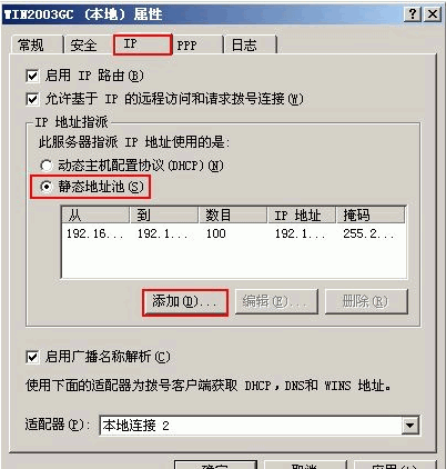 隨即,VPN服務即成功啟動。單擊服務器名稱-屬性,在彈出的對話框中選中 IP 選項卡,在IP地址指派中選中靜態地址池,單擊添加,如圖所示: