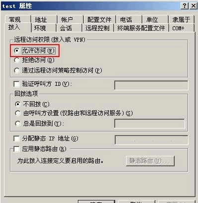 2. 在test屬性對話框中,單擊撥入選項卡。在遠程訪問權限中選中允許訪問,單擊確定,如圖所示: