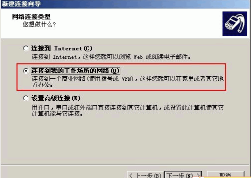 2. 彈出“歡迎使用新建連接向導”,下一步,網絡連接類型頁面中選擇“連接到我的工作場所的網絡”。下一步,如圖所示: