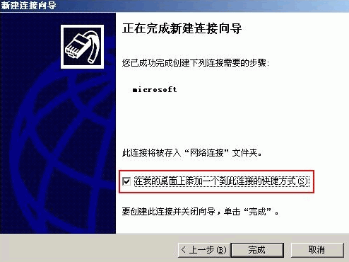 7. 在完成新建連接向導中,選擇“在我的桌面上添加一個到此連接的快捷方式”,完成;
