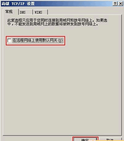 在“高級TCP/IP設置”對話框的“常規”中取消選中的“在遠程網絡上使用默認網關”,單擊確定,如圖所示。