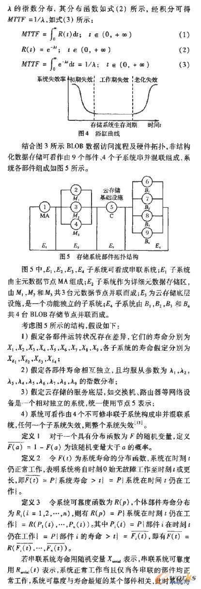 通常,評估系統的可靠性可從研究系統可用性、失效率和系統生命周期著手,統計學經常使用圖4所示的“浴缸曲線”描述系統生存周期。由該曲線可知,非結構化數據存儲系統生存周期將經歷初期失效、工作期失效和老化期失效三個階段。其中,早期失效和老化期失效服從典型的威布爾分布,而工作期失效則服從參數為λ的指數分布,若系統由多部件組成,其部件失效時間也服從負指數分布。本文則重點關注系統正常工作期的可靠性評估,并假定系統工作期失效率是恒定的。由曲線可知,系統可靠性與正常工作時間t有關,若用R(t)表示系統正常工作期的可靠度函數,其參數t的區間為(0,+∞),則系統在t時刻前正常運轉而無需維修。事實上,經常使用系統平均無故障時間(Mean Time To Failure,MTTF)描述系統可靠性,則MTTF為函數R(t)在區間(0,+∞)上的定積分,如式(1)所示。又由R(t)服從參數為