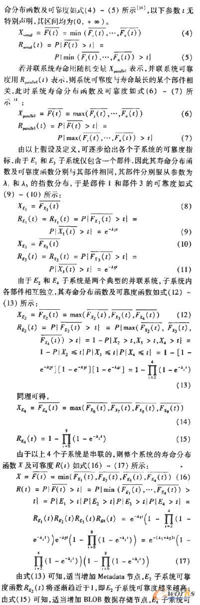 目前,存儲服務質量評估可從系統可靠性、服務可用性這兩個角度著手,有些學者還從系統可生存性角度進行研究。通常借助于初等概率論、隨機過程、可靠性原理、Markov鏈、模擬等進行系統建模和可靠性論證,有時還結合數據處理流圖及拓撲圖等工具進行較直觀的分析。