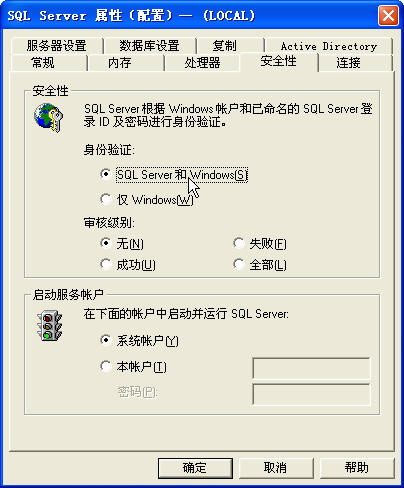 2、在屬性對話框中選擇安全性選項,在身份驗證處選擇“SQL Server和Windows”,然后確定。