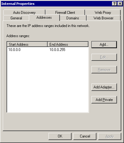 首先,你得確認你的內部網(wǎng)絡地址集中包含了整個內部網(wǎng)絡。這是非常重要的,因為IPSec策略必須在建立連接的兩邊都要匹配,否則,連接不會建立。打開你內部網(wǎng)絡的屬性,如下圖: