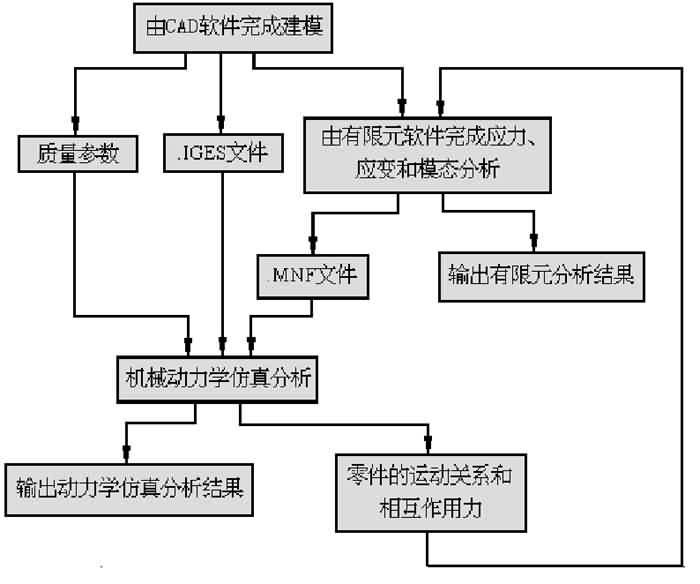從以上的分析知道,要想更好地完成CAE任務(wù),將CAE軟件與其他的CAX集成使用會獲得更好的效果。作為一個例子,圖2是實施這一集成的流程圖。這個例子中,首先由CAD軟件生成幾何模型,按.IGES格式或其他格式將模型輸出,然后由有限元軟件和機械動力學(xué)軟件分別讀入幾何模型。有限元軟件根據(jù)CAD軟件生成的幾何模型和機械動力學(xué)軟件計算得到的結(jié)點力完成應(yīng)力、應(yīng)變和模態(tài)分析并輸出分析結(jié)果。機械動力學(xué)軟件所需要的模型分成兩種類型:剛體模型從CAD軟件獲得;柔體模型從有限元軟件獲得(.MNF格式文件)。另外,如果某些零件的模型由機械動力學(xué)軟件自己生成,根據(jù)需要可從CAD軟件得到質(zhì)量參數(shù)。機械動力學(xué)仿真分析除了輸出最終結(jié)果外,還可輸出零件的運動關(guān)系和結(jié)點力供有限元分析之用。