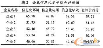我們以東莞市被調(diào)查的部分中小型制造企業(yè)2006年各項(xiàng)指標(biāo)為樣本,使用上述評(píng)價(jià)方法計(jì)算各企業(yè)的信息化水平綜合評(píng)價(jià)值,排名前5的企業(yè)得分情況如表2所示。