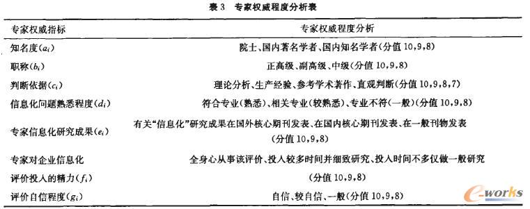 進行企業實施信息化能力評價時,需要把定性數據進行量化,同時需要求解各指標的權重。對于這些工作,專家的參與是必不可少的,而不同的專家,權威程度不同。本文在前期研究工作的基礎上,根據專家的知名度、職稱、判斷依據等方面來考察專家的權威程度。對專家權威程度的分析,見表3所列。