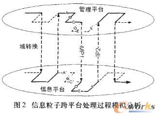 按照域映射理論和信息化平臺匹配理論,信息流在信息平臺的處理過程是對其在管理平臺運行過程的“快照和模擬”。企業(yè)信息化初期,要經(jīng)歷手工替代的漫長過程,管理域中的一個完整流程被劃分成隸屬于管理域和信息域的兩個子集,由多個流程碎片組成,處理主體分別為人和信息系統(tǒng)。流程分割造成信息流跨越兩個域,信息粒子要在管理域和信息域之間遷移。如圖2所示。經(jīng)過 手 工 替代,管理流程被劃分在兩個域且需要串聯(lián)運行,必然形成信息粒子由管理域向信息域、信息域向管理域的多次往復,信息粒子穿越和形式轉(zhuǎn)換形成了信息導人和導出工作:手工方式處理完成的信息要手工導入信息系統(tǒng),滿足下一個階段IT/IS處理的要求;而IT/IS處理完成后生成的信息則以特定的格式打印輸出,供人工處理。信息導入和導出需要大量人工,耗時費力,有時執(zhí)行一個完整工作流程,需要多次導入和導出相同或相似的信息內(nèi)容,造成資源浪費和效率降低。企業(yè)信息化初期,管理效率不升反降即由此造成。