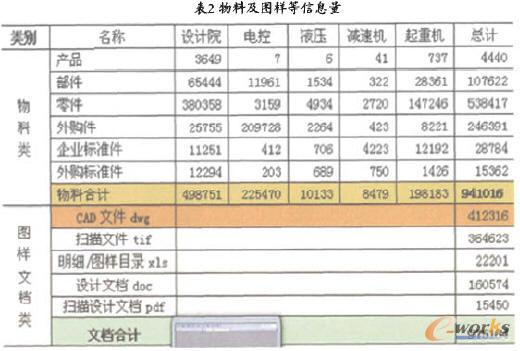 3)PDM電子倉庫信息量:從2004年6月16日上線至2008年2月16目止,系統已經穩定運行近4年時間,產品覆蓋面如表1所示。物料及圖樣等信息量如表2所示。