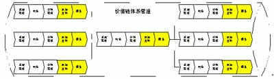 讀者知道,采用縱向一體化的企業,必然會形成多個并行的不同的原材料的供應過程,這必然引發向后一體化部分的擴充,它會形成一組提供各類原材料的供應機構;同樣向前一體化部分的擴充,也會形成多個不同的銷售機構,那么此時的價值鏈體系將會被改造成這樣的體系(見下圖):