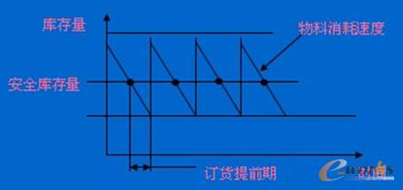 傳統的庫存計劃和控制方法是訂貨點法。訂貨點法又稱訂購點法,是一種在庫存物資由于消費下降到一定數量(這個數量稱為訂貨點)時,就派員進行訂貨,以期在庫存耗盡之時所訂物資正好到貨的方法。這種方法的特點是:假定訂貨提前期、市場供應、裝運條件是不變的,每次訂貨的批量是相等的,訂貨時間是隨著物資庫存量降到訂貨點時間的不同而變化的。因此,在生產對物資的消耗速度不均衡的情況下,可以利用在訂貨點派人訂貨來適應物資消費速度的變化,保持物資儲備的合理性。圖1就是傳統的訂貨點法: