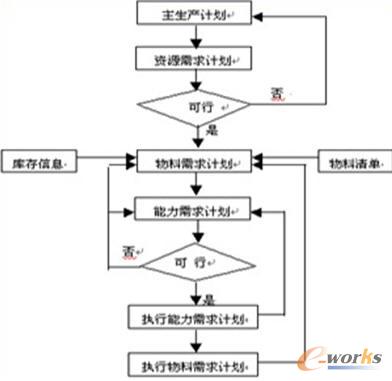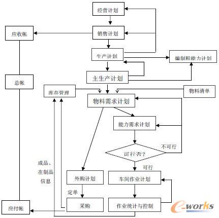 于是,在八十年代,人們把生產、財務、銷售、工程技術、采購等各個子系統集成為一個一體化的系統,并稱為制造資源計劃(Manufacturing Resource Planning)系統,英文縮寫還是MRP ,為了區別物料需求計劃(亦縮寫為MRP )而記為MRPII。圖4是MRPII的邏輯流程圖。