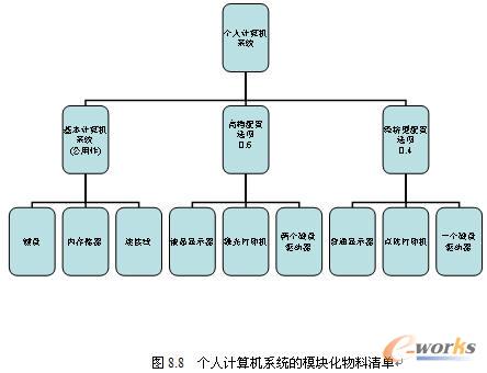 下面我們考慮一個使用模塊化物料清單的例。某公司生產的個人計算機系統有兩種不同的配置,普通型配置包括液晶顯示器、激光打印機和兩個磁盤驅動器,經濟型配置包括普通顯示器、點陣打印機和一個磁盤驅動器。