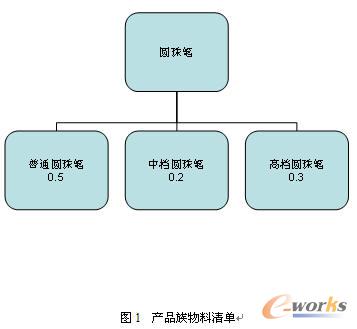 圖1給出了一個產品族物料清單的例子。其中,已經對圓珠筆產品族做出了預測,圓珠筆產品族由三種產品組成,即普通圓珠筆、中檔圓珠筆和高檔圓珠筆。根據歷史數據,計劃員確定,市場對圓珠筆的需求50%是普通圓珠筆,30%是中檔圓珠筆,20%是高檔圓珠筆。在產品族物料清單中顯示了這些百分比。假定對圓珠筆產品族在某個特定時區的預測是300支,那么計劃員將通過產品族物料清單得到每種圓珠筆的需求預測如下: