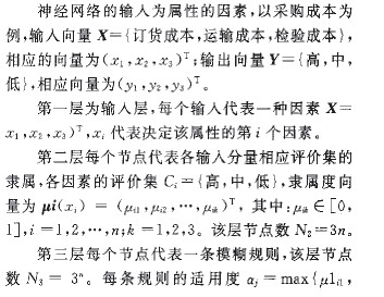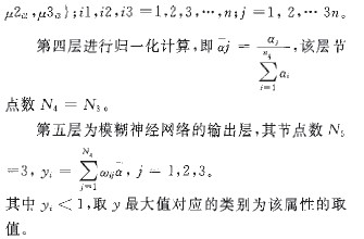 由于在分類樹的節點上將每個屬性的情況分為高,中,低三個級別,但是有些屬性由多個因素決定,很難直接做出判斷。在判斷過程中,有關因素可能出現取值不確定性。模糊神經網絡除具有神經網絡的一般特點外,叉具有處理模糊信息的特點,并使模糊處理過程具備學可功能,能以任意精度逼近任意非線性函數。因此,筆者結合模糊神經網絡將多屬性決策問題轉換為多屬性分類問題,即將每個屬性分為高,中,低三類,每個備件的該屬性的值由該備件該屬性上屬于的那一類給出。模糊控制與神經網絡結合有很多種方式,筆者選用基于模糊系統標準模型的模糊神經網絡結構(如圖5)。