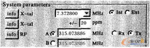 CC1000 是一種理想的超高頻單片收發(fā)芯片,其主要工作參數(shù)能通過串行總線接口編程改變。通常典型的系統(tǒng)是由CC1000與一個(gè)微控器以及一些外圍無源元件一起構(gòu)成,標(biāo)準(zhǔn)應(yīng)用電路見圖3。在CC1000設(shè)計(jì)中,對(duì)CC1000的相關(guān)寄存器進(jìn)行相應(yīng)的優(yōu)化配置至關(guān)重要,錯(cuò)誤的配置可能導(dǎo)致CC1000不能正常工作。圖4是利用TI公司給出的SmartRF Studio程序在本系統(tǒng)中對(duì)發(fā)射器設(shè)計(jì)時(shí)芯片的晶振、發(fā)射和接收的頻率配置。CC1000的控制是通過對(duì)其控制寄存器的配置完成的,要求MCU 能夠通過三串行控制口(PCLK/PDATA/PALE)控制CC1000改變不同的工作模式,且要求MCU能夠與雙向同步數(shù)字信號(hào)接口。