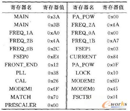 CC1000初始狀態(tài)為待機(jī)模式,傳感器采集到身份碼接收器發(fā)送的加密數(shù)據(jù)后,先發(fā)送給AT—mega88,由ATmega88進(jìn)行控制并檢測(cè),將數(shù)據(jù)通過I/O 口發(fā)送給CC1000,此時(shí)CC1000被信號(hào)激活并進(jìn)入發(fā)射模式,將數(shù)據(jù)轉(zhuǎn)換為數(shù)據(jù)幀發(fā)送給身份碼接收器中的接收模塊。需要注意的是,在發(fā)送之前,主控制器ATmega88需要對(duì)CC1000進(jìn)行初始化并配置相應(yīng)的寄存器。表1為CC1000初始化后其主要寄存器的配置值和配置順序。而數(shù)據(jù)信號(hào)發(fā)送成功后,CC1000和ATmega88重新進(jìn)入休眠狀態(tài),達(dá)到減少功耗和節(jié)約電池電量的效果。