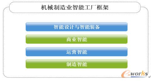 而對于機械制造業(yè)而言,智能設計與智能裝備、商業(yè)智能、運營智能、制造智能構成了機械制造業(yè)智能工廠的整體框架,如圖3所示。