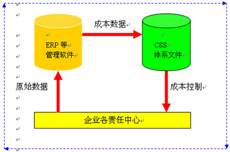 企業管理實際上是由不同體系來組成的,包括成本體系、質量體系、人力資源體系、營銷體系、技術開發體系、供應體系、生產管理體系、物流體系等。因此企業管理的本質無論是過去、現在還是將來均是體系化管理,而不是信息化管理,任何計算機管理軟件都是體系化管理下的技術工具。沒有體系化管理的支持,技術工具的有效性將受到極大影響。根據CSS建立的成本體系將在成本核算模型、數據采集規范、成本控制制度和流程、關鍵績效評估指標和資源管理等方面支持ERP等管理軟件的使用。CSS成本體系與ERP的關系是: