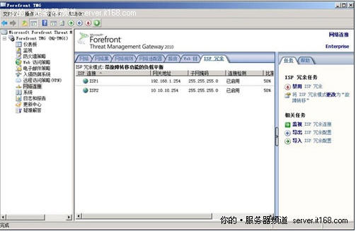 ISP-R是TMG中一個非常好用的新增功能,我們對這個功能仰慕已久,可惜ISA一直沒有提供這個功能。無數管理員曾經在論壇上無助地詢問:ISA服務器能否使用兩條ISP鏈路啊?答案是否定的!四年等一回,TMG終于給我們帶來了ISP-R。現在ISP-R既可以利用兩條ISP鏈路實現負載平衡,也可以實現故障轉移。如下圖所示,TMG服務器上同時使用了兩條活動的ISP鏈路。(圖2)