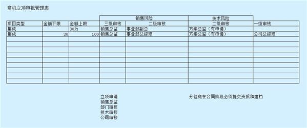 在商機階段變化到立項階段時,就會有一系列的管理要求,一些必須清楚的內容,在系統中就是必填的字段也明確的。有這點還不夠,還需要對什么類型的項目、多大的規模,競爭對手是誰,等等,一一作出規定,需要什么樣的管理,而這些管理也是企業最為復雜、最為頻繁的工作,如何將其規范,讓系統自動進行處理,在商機立項審批工作流執行中發揮出作用,這是管理系統設計的一個重要內容和環節。而這個環節也正是目前國內品牌ERP,甚至是國外的品牌ERP處理得相當不好的地方。