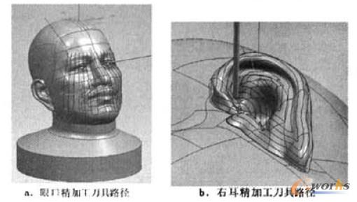 b)右耳部分加工:報據耳朵的實際輪廓,在不產生刀具干涉問題的方向上建立新的工件坐標系。然后以該坐標系進行刀具路徑編制。