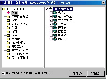 1. 在界面左邊的樹控件中選擇要進行修改數據權限項﹐系統自動在右邊的樹中刷新出數據權限項所對應的所選操用員所擁有的有的數據權限。數據權限的授與各取消操作方式同菜單權限的操作方式一致。當在數據類別之切換時﹐系統根據界面下部的選擇框的設定決定由系統自動保存上一數據類別的修改還是提示用戶手工保存。