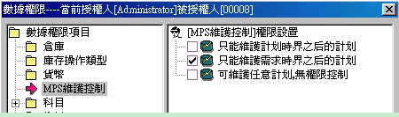 MPS維護權限只能由系統的adminsrtartor用戶來對其它進行業務操作的操作員進行授與﹐取消﹐且在三個維護類型中只能同時授也一項﹐或取消所有。如下圖3-10