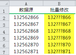 如下圖所示,將A列數據源,中間三位數字用三個號替換。效果如B列。