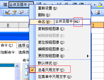 第一步,單擊工具——自定義,在自定義模式下,右擊工具欄上的合并單元格圖標,勾選“總是只用文字”。