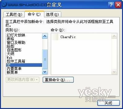 在如圖界面中將“命令”下邊列表框中的“CharuPic”宏拖動到工具欄中的任意位置,松開鼠標后,在工具欄上就會出現一個名為“CharuPic”的按鈕,右擊該按鈕,在出現的右鍵菜單中,將按鈕的名稱修改為“批量插入背景圖片”;在“更改按鈕圖像”子菜單中選擇自己喜歡的圖片作為按鈕的背景,最后關閉“自定義”對話框。