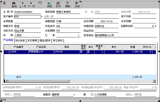 銷售合同錄入記錄企業(yè)與客戶簽定銷售產(chǎn)品的詳細(xì)資料,包括產(chǎn)品明細(xì),協(xié)議條款,贈(zèng)品\配件和其它資料等。銷售合同管理對(duì)銷售合同進(jìn)行審核、反審、修改、刪除等操作。