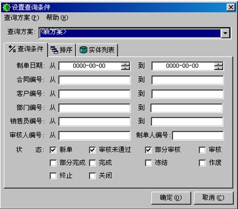 查詢方式有三種:定位、自定義查詢、查詢。查詢接口如下圖所示,接口上列有查詢條件:制單日期、客戶、部門、單據(jù)狀態(tài)。可對(duì)接口上的條件進(jìn)行任意組合,具體設(shè)定請(qǐng)參見《公共操作手冊(cè)》。