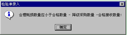 c. 特采:此時,特采數量=檢驗合格數量,您可以修改特采數量和合理損耗,同樣要保證特采數量+合理損耗不大于檢驗合格數量。否則彈出上圖所示窗口。在特采情況下,您還要錄入特采價格,以便應付系統能計算應付帳款。