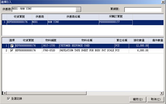 4. 擇所檢驗的物料所屬的收貨單記錄。系統自動顯示出所選收貨單的未檢物料。如下圖 所示。