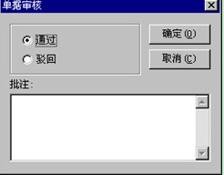 4. 審核:選擇一張新檢驗報告,點擊工具欄的審核或菜單中的審核。出現如圖所示的審核對話框,選擇‘通過’或‘駁回’,也可加上批注,之后按確定,回到檢驗報告管理界面,所選擇的檢驗報告狀態已經變成了‘審核’(選擇通過)或‘審核未通過’(選擇了駁回),審核完成。
