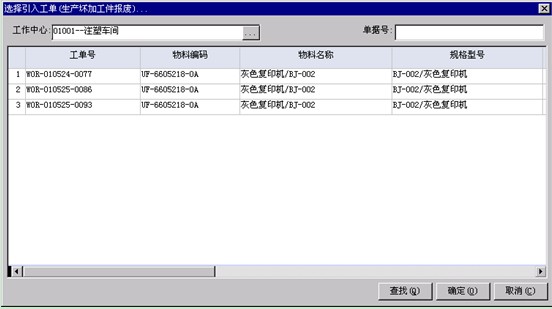2. 選擇或錄入工作中心和回收倉庫,之后,點引入或雙擊‘通知單號’,系統彈出引入窗口,該窗口顯示了所選工作中心的可以報廢的工單、物料及其可以報廢的數量(如下圖),在此窗口中選擇一條記錄,按確定。