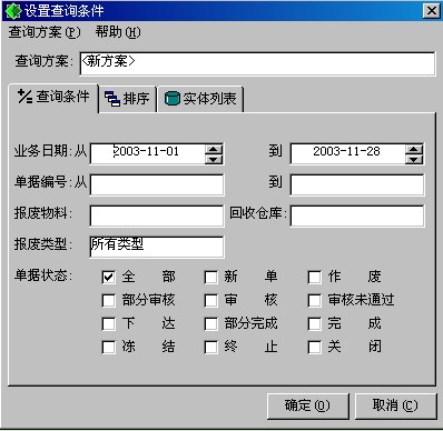 4. 刪除:選擇一張狀態為‘新單’的報廢單,點工具欄中的 或菜單[文件\刪除],系統彈出庫認框,按是將刪除,按否取消刪除。