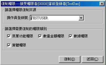 點(diǎn)擊復(fù)制,打上勾的許可權(quán)類別就會從許可權(quán)來源操作員復(fù)制給接收許可權(quán)者。