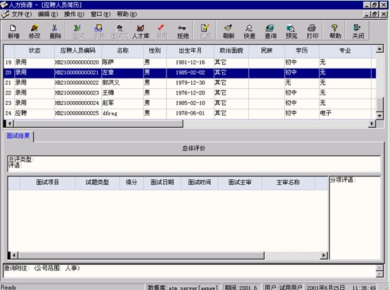 1、 面試:選取某個(gè)應(yīng)聘狀態(tài)的記錄,點(diǎn)擊菜單“面試”則界面中此條記錄的狀態(tài)為“面
