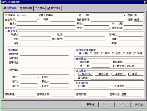 1、新增:點(diǎn)擊菜單“新增”其所示畫面如圖3-7。錄入應(yīng)聘人員簡(jiǎn)歷。