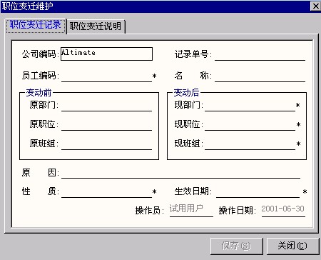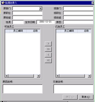 2、批調(diào): 用來錄入某一批員工從一個崗位轉(zhuǎn)到另一個崗位變動信息其界面如圖