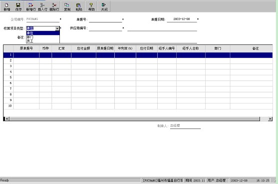 其它應(yīng)付款期初余額錄入界面項(xiàng)目參見(jiàn)本章2.4.1.4項(xiàng)目說(shuō)明。操作步驟同本章2.4.1.5操作步驟。但操作界面略有不同如圖2-9所示。表頭中’核算項(xiàng)目類型’欄必須錄入,核算項(xiàng)目類型由系統(tǒng)給出默認(rèn)值,用戶可以選用但不可以維護(hù)。另外查詢界面上的查詢條件不同如圖2-10,但查詢方法一樣。