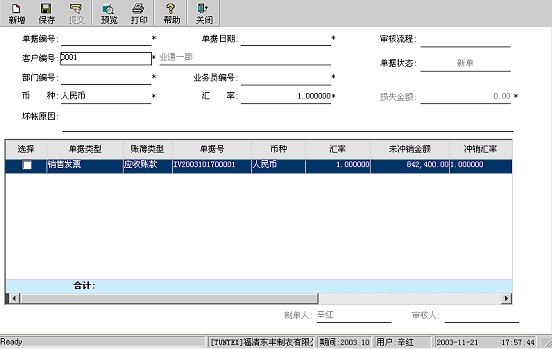 發生損失的記錄的業務員,選定壞賬記錄后,系統自動帶出原業務員,但用戶可以維護。 |