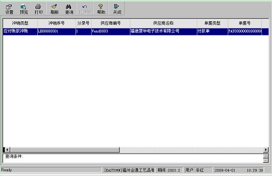 2、 自動沖銷:在如圖3-29所示的界面上,單擊菜單自動沖銷,系統自動將同一供貨商、同一幣種、且金額相等的不同單據進行沖銷,如果沖銷成功則產生沖銷流水,更新沖要銷日志。